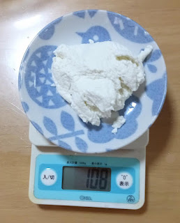 クッキングシートからチーズを取り出します。108g程度取れました。